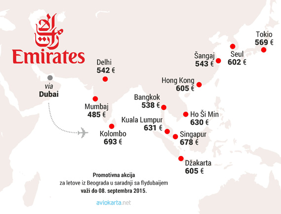 Promotivna akcija traje za putovanja u periodu od 15. avgusta pa sve do 31. maja 2016. i važi za putovanja u ekonomskoj klasi do 11 izabranih destinacija Emiratesa.