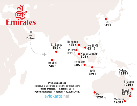 Promocija se odnosi na putovanja iz Beograda, preko Dubaija, do koga se stiže direktno flydubaijem, partnerskom kompanijom Emiratesa.