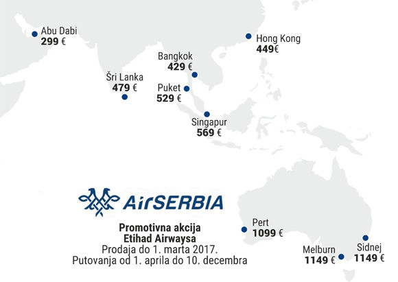 Na promociju je pet gradova u Aziji i tri u Australiji, oni su sada dostupni po nižim cenama putnicima za polaske iz Beograda sa presedanjem u Abu Dabiju.