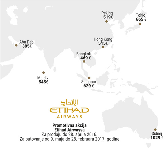Povratna karta u ekonomskoj klasi do Abu Dabija košta 385 evra, do Bangkoka je 469 evra, a do Sidneja – za koji Etihad leti direktno iz Abu Dabija – 1029 evra.