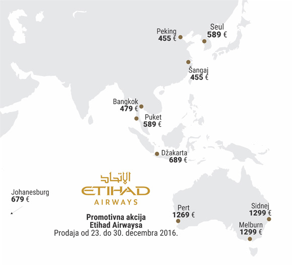 Nova promotivna akcija Etihad Airwaysa trajaće do petka, 30. decembra, za putovanja tokom čitave naredne godine, sve do 1 decembra 2017.