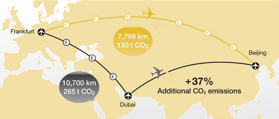 Ilustracija: Lufthansin proračun troškova na ime kupovine kvota za emisije štetnih gasova, koji pokazuje kako su neevropske aviokompanije favorizovane u odnosu na evropske, (c) Lufthansa, 2010.