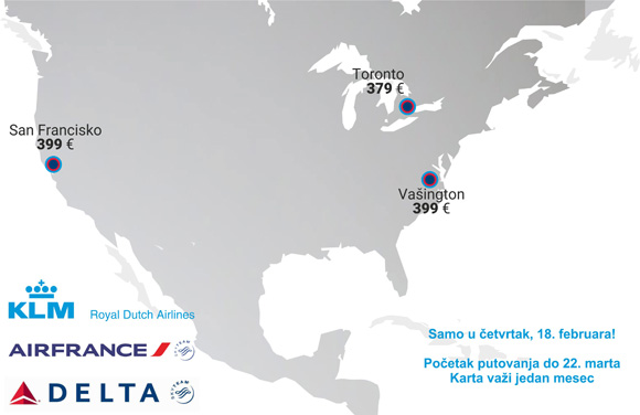 U saradnji sa našom Air Serbijom ove tri kompanije povezale su Beograd sa svim američkim i kanadskim gradovima. Možete putovati – najčešće – preko Pariza, Amsterdama ili Brisela, ali i preko Rima ili Milana, preko Frankfurta, Diseldorfa ili Štutgarta. Ogromna mreža linija vam omogućava da skoro uvek vaš agent može da za vas pronađe ovde prikazane najpovoljnije cene.