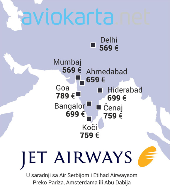 Indijska kompanija Jet Airways je deo Etihad grupe, kao i naša Air Serbia. Oni lete do 48 gradova u Indiji, u ovom prikazu mi smo izabrali osam gradova – Delhi, Mumbaj, Goa, Čenaj, Bangalor, Koči, Hiderabad i Ahmedabad.