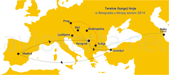 Pored dve nove pomenute kargo linije u Beogradu već duže vreme postoje i redovne linije ka Budimpešti (mađarski CityLine Hungary avionom Antonov An-26B) i Ljubljani (slovenački Solinair avionom Saab 340A). Redovnu liniju Prag – Beograd – Sofija održava i češki avioprevoznik ČSA malim avionom ATR 72-200 iznajmljenim od Farnaira. Registrovanu kargo liniju od Beča do Beograda ima i Lufthansa Cargo, a povremeni ali čest gost u poslednje vreme na Surčinu je i azerbejdžanski teretni džambo džet Silk Way Airlinesa (Boeing 747-400F).