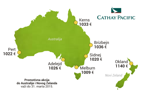 Iako i ranije prisutna na tržištu Srbije, aviokompanija iz Hong Konga, Cathay Pacific, ponudila je prvu ozbiljnu promotivnu akciju. Letovi preko Evrope i Hong Konga do Australije i Novog Zelanda nikada nisu bili povoljniji. Povratne karte do australijskih gradova Sidnej, Melburn, Brizbejn, Adelejd, Pert i Kerns koštaju od 1009 do 1036 evra, a do Oklanda na Novom Zelandu 1140 evra. U ovu cenu su uključene sve takse i nadoknade, a putnici koji izaberu Cathay imaće priliku da lete jednom od nekoliko aviokompanija na svetu koje imaju pet zvezdica.