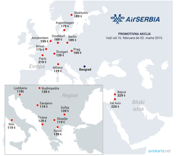Domaći avioprevoznik Air Serbija, takođe prati svetske trendove, pa je u ovom mesecu započela nekoliko velikih promotivnih akcija. Osim uobičajenih promocija "Srećan petak" ili "Super subota", Air Serbia je imala i akciju povodom Dana zaljubljenih, kada je prodavala dve karte po jednoj ceni. Trenutno je u toku velika promotivna akcija do većine evropskih i bliskoistočnih destinacija našeg avioprevoznika. Gradovi u regionu su nam na raspolaganju već od 119 evra koliko košta povratna karta do Skoplja, Sarajeva, Ljubljane ili Rima, Evropa se može naći već od 139 evra koliko je povratna karta do Štutgarta, a na Bliskom istoku izdvojio se Tel Aviv sa cenom povratne karte od samo 229 evra.