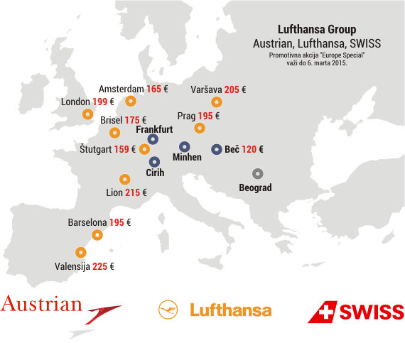 Evropa je na promociji i kod tri aviokompanije Lufthansa Grupe (Lufthansa, Austrian i SWISS). Povratna karta do Beča košta 120 evra, Amsterdama 165 evra, Barselone 195 evra. U ponudi su još i London, Pariz, Brisel, Lion, Prag, Varšava… Promocija traje do 6. marta, a letovi su preko čvorišta ove tri kompanije u Beču, Frankfurtu, Minhenu ili Cirihu.