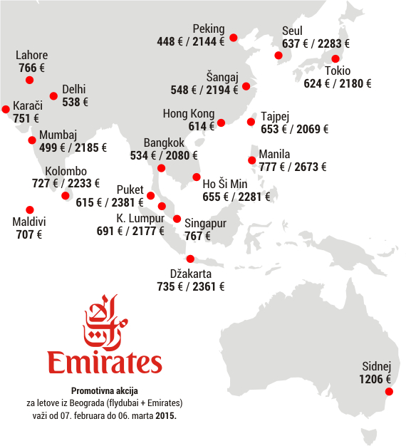 Aviokompanija Emirates, u saradnji sa svojom partnerskom aviokompanijom flydubai, nudi dvadesetak gradova u Aziji, Africi i Australiji po više nego povoljnim cenama. Letom preko Dubaija možete stići do Pekinga i nazad za ukupno 448 evra ili do Bangkoka za 534 evra. U isto vreme flydubai nudi još niže cene aviokarata do četiri izabrane destinacije, koje su inače popularne među putnicima u Srbiji. Ako želite u uvek topli i sunčani Dubai, povratnu kartu do kraja februara možete platiti samo 230 evra. Ljubitelji planinarenja i budizma mogu posetiti Nepal uz stvarno neverovatnu cenu povratne karte do Katmandua od 330 evra. Maldivi, koralni arhipelag u Indijskom okeanu, nije nikada bio dostupniji srpskom putniku. Ovaj simbol za rajski odmor dostupan je za samo 430 evra, isto koliko će koštati i povratno putovanje do susedne Sri Lanke, egzotične i uzbudljive ostvrske države na krajnjem jugu indijskog potkontinenta.
