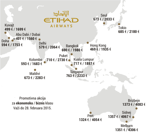 Etihad Airways, partner i suvlasnik domaće Air Serbije, do kraja februara takođe nudi veliku promotivnu akciju koja uključuje destinacije u Aziji i Australiji. Atraktivno tajlandsko letovalište Puket je na raspolaganju putnicima iz Srbije uz cenu povratne karte od 710 evra, a nešto malo skuplji su Kuala Lumpur i Singapur. Promocija važi do kraja februara, a letovi su preko Abu Dabija.