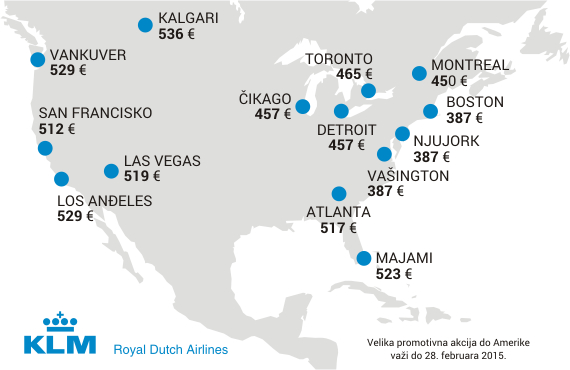 Najnoviji trend je spuštanje cena aviokarata ka Severnoj Americi. U okviru još uvek aktuelne promotivne akcije holandskog KLM-a i Air France putnici mogu da lete do Njujorka i nazad za ukupno 387 evra. Ova cena je u svakom smislu neverovatna, ali je, na radost brojnih putnika, stvarna. Promocija će trajati do kraja februara, a putnici osim do Njujorka mogu da lete i do Kalifornije po ceni od tek nešto preko 500 evra sa svim taksama ili do traženih Čikaga ili Toronta za 457, odnosno 465 evra.