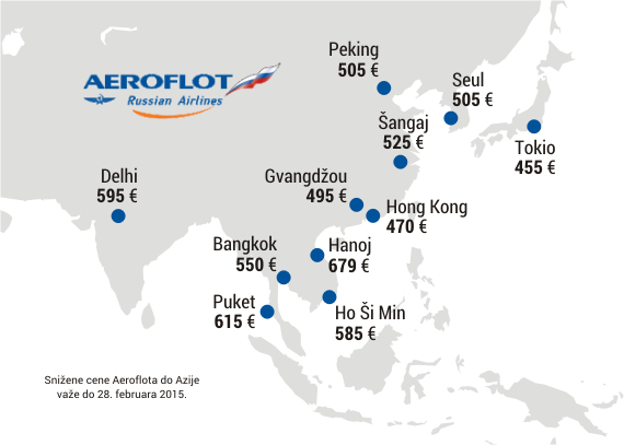 Ruski Aeroflot, koji već dugo vlada azijskim tržištem, do kraja februara nudi izuzetno povoljne cene aviokarata. Povratna karta za let u ekonomskoj klasi do Hong Konga koštaće samo 470 evra, a do Tokija čak i manje – 455 evra. U ove cene su uključene sve takse, a osim ta dva grada putnici mogu izabrati i Hanoj, Ho Ši Min, Peking, Šangaj, Guangdžou, Delhi, Bangkok ili Puket.