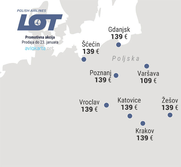 Povratna karta u ekonomskoj klasi do Varšave je sada samo 109 evra, a za putovanje preko Varšave do drugih poljskih gradova – do Gdanjska, Katovica, Žešova, Poznanja, Krakova, Šćećina i Vroclava, karte koštaju 139 evra u dinarskoj protivvrednosti na dan kupovine.