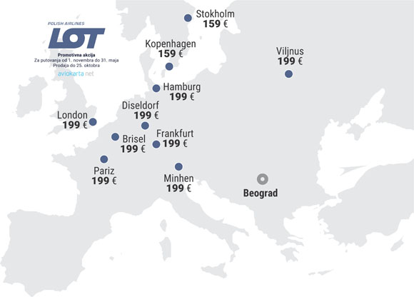 LOT je objavio promociju i do svojih evropskih destinacija – Minhen, Frankfurt, Hamburg, Diseldorf, Pariz, London, Brisel, Viljnus – po 199 evra za povratnu kartu sa svim taksama, dok su Stokholm i Kopenhagen samo 159 evra.