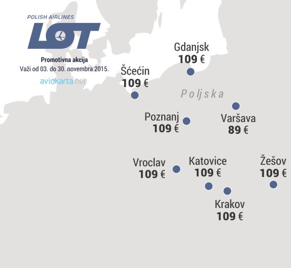 Do Varšave u ekonomskoj klasi povratna karta se može sada kupiti za samo 89 evra, dok je do ostalih gradova (Krakov, Gdanjsk, Šćećin, Vroclav, Katovice, Žešov) 109 evra.