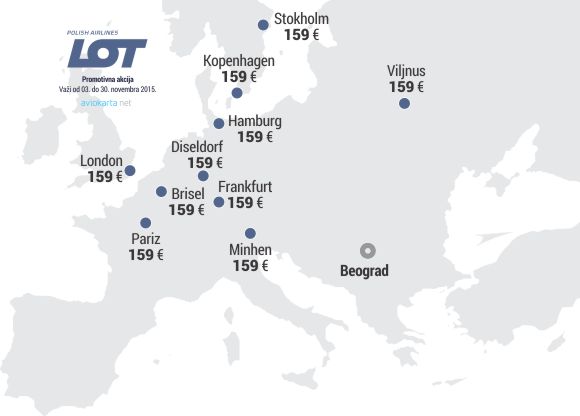 LOT je objavio promociju i do svojih evropskih destinacija – Minhen, Frankfurt, Hamburg, Diseldorf, Pariz, London, Brisel, Kopenhagen, Stokholm, Viljnus – svi gradovi su po 159 evra za povratnu kartu sa svim uračunatim taksama.