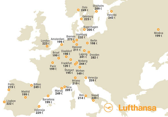 Kao što vidite, cene su dosta povoljne i možete lepo uštedeti ako se odlučite za ovakvu varijantu – naročito kada su u pitanju putovanja u gradove koje ne pokriva Wizzairova ili Air Serbijina mreža. A takvih gradova ima puno u Evropi. Gde god ne možete putovati Wizzom ili Air Serbijom sigurno možete Lufthansom. Cene do 33 grada su prikazane na našoj mapi, u cene su uključene i sve takse, kao i posluženje na letovima.