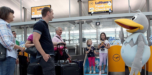 Porodice će u ovim posebnim zonama koje su im namenjene dočekivati Lu i Cosmo, dva ždrala, maskote Lufthanse. Oni će putnike provesti preko tepiha koji predstavlja pistu.