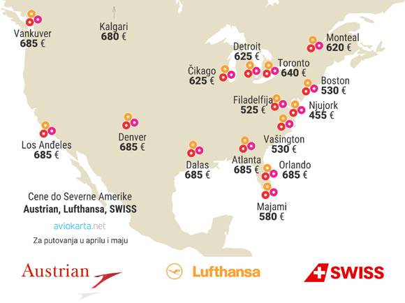 I ako nije trenutno promotivna prodaja u toku, ovih dana možete da kupite karte po povoljnim cenama do svih gradova u Sjedinjenim Američkim Državama i Kanadi, sa polaskom iz Beograda i presedanjem u nekom od glavnih čvorišta ove tri kompanije: Beču, Frankfurtu, Minhenu ili Cirihu.