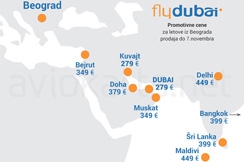 | Tokom promocije cena povratne karte u ekonomskoj klasi do Dubaija je 279 evra, ali mnogo zanimljivija je cena za Bangkok – samo 399 evra, Kolombo, glavni grad Šri Lanke je takođe 399 evra, dok su Maldivi, nova destinacija Flydubaija 449 evra, koliko košta i Delhi. |