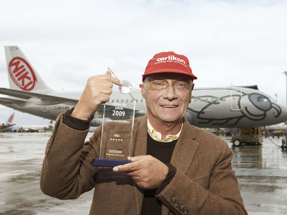 Na fotografiji: Niki Lauda sa nagradom za najboljeg lowcost avioprevoznika u 2009.
