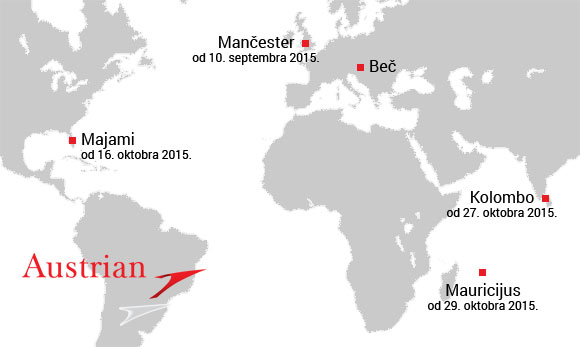 27. oktobra Austrian Airlines počinje da leti za Kolombo, glavni grad Šri Lanke. Na ovoj liniji leteće Boing 767. Imaće savršenu konekciju sa letom iz Beograda u oba pravca, ali ne i konkuretntu cenu, najjeftnija karta je 695 evra, što trenutno ne može da se takmiči sa cenama koje za putovanja iz Beograda nude Qatar ili Etihad. Dva dana kasnije, 29. oktobra, Austrian otpočinje letove ka Mauricijusu. Tu liniju će za početak Austrian održavati samo jednim letom nedeljno, četvrtkom, ali će od sredine decembra biti pojačana još jednim letom. U svakom slučaju, moći ćemo da putujemo Austrianom do Mauricijusa, nažalost cena za povratnu kartu na ekonomskoj klasi je preko 1000 evra.