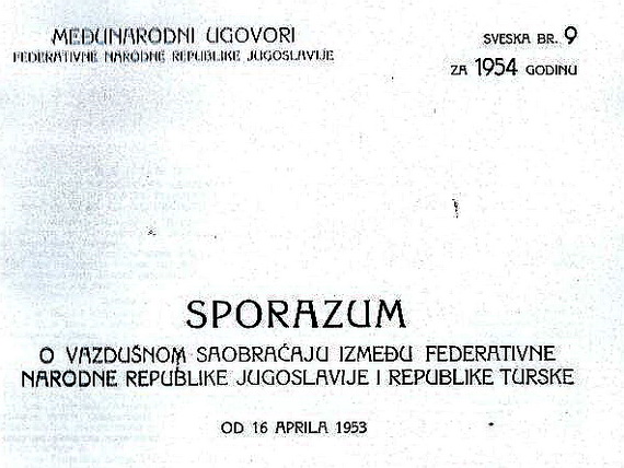Ovaj zastareli sporazum koji predviđa reciprocitet dva izabrana nacionalna avioprevoznika u obavljanju redovnog saobraćaja i koji ne reguliše pitanje čarter saobraćaja, trebalo je da bude zamenjen početkom devedesetih godina prošlog veka. U trenutku kada je novi sporazum bio spreman za potpisivanje raspala se Jugoslavija, pa je on odbačen sa turske strane. Sve nove države nastale raspadom Jugoslavije su potpisale nove bilateralne sporazume sa Turskom (i drugim državama), samo je Srbija nastavila da poštuje stare jugoslovenske sporazume koji datiraju iz perioda nakon drugog svetskog rata.