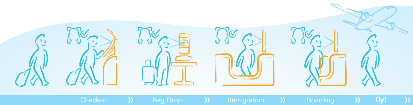 Na početku svih procedura, putnik dolazi na aerodrom i prijavljuje se na specijalnom kiosk uređaju, gde mu se snima lice. Sve naredne procedure obuhvataju specijalne trake za prolaz putnika na osnovu prepoznavljanja prethodno registrovanog lica.