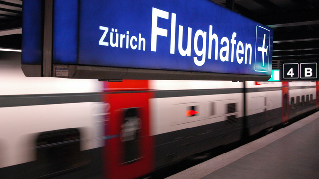 Aerodrom je sa centrom grada povezan železničkim linijama. Linije InterCity i InterRegio povezuju aerodrom sa gradom, vožnja je veoma brza, traje samo 10 minuta. Karta u jednom smeru košta 6,6 CHF, a povratna je 13,2 CHF. To je cena prema tarifi lokalnog gradskog prevoza i obuhvata tri zone što je dovoljno na relaciji od aerodroma do centra.