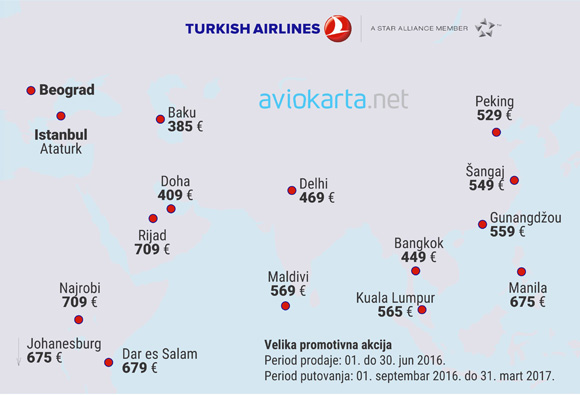Ovom kompanijom možete leteti povoljno iz Beograda do Istabula dva puta dnevno i dalje preko njihove baze na aerodromu Ataturk do svih ovih destinacija. Promocija za koju je počela prodaja trajaće do 30. juna.
