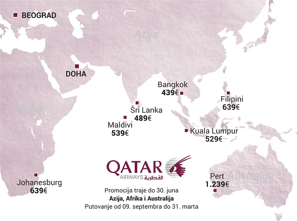Na junskoj promociji kompanije Qatar Airways našlo se 7 destinacija raspoređenih na 3 kontinenta – Johanesburg je 639 evra, Maldivi samo 539 evra, dok do 30. juna možete kupiti povratnu kartu za Kuala Lumpur za 529 evra, sa svim taksama i uključenim prtljagom.