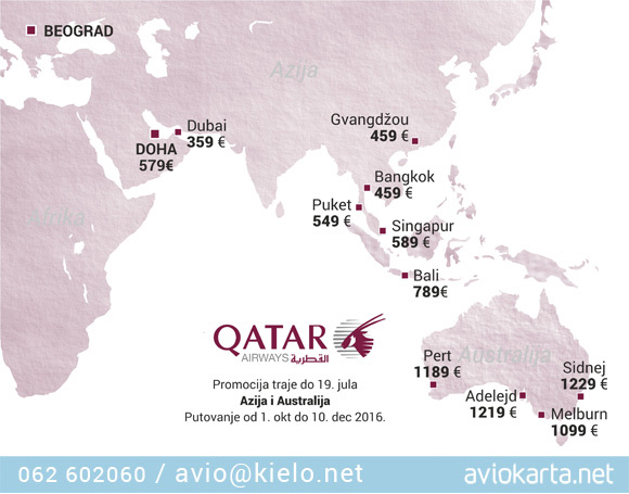 Na julskoj promociji kompanije Qatar Airways našlo se 11 destinacija raspoređenih na 2 kontinenta – Dubai je 359 evra, Melburn 1099 evra dok do 19. jula možete kupiti povratnu kartu za Singapur za 589 evra, sa svim taksama i uključenim prtljagom.