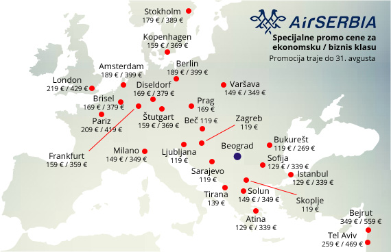 Na biznis klasi cene za Milano, Frankfurt, Štutgart, Berlin, Varšavu, Amsterdam, Stokholm, Kopenhagen i Diseldorf se kreću između 349 i 399 evra.