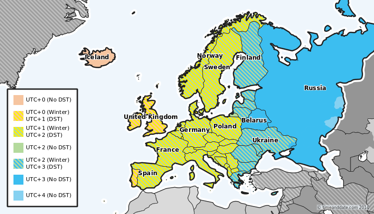 Ove godine je izuzetak Rusija, koja neće prelaziti na letnje računanje vremena, tako da će između ove zemlje i griničkog vremena (GMT) biti razlika od dva sata, a između Rusije i centralno-evropske vremenske zone (CET) u kojoj se i Srbija nalazi razlika će se smanjiti na jedan sat. Istočno-evropska vremenska zona (EET) u kojoj se nalaze zemlje Baltika, Ukrajina, Rumunija, Bugarska, Grčka i Turska imaće isto vreme kao i Rusija.