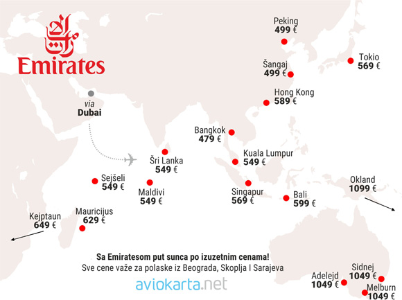 Sva odredišta i cene karata možete videti u priloženoj mapi u kojoj su cene prikazane sa svim uračunatim taksama i sa uključenim prtljagom do 30kg. Posluženje je uključeno u cenu na letovima Emirata.