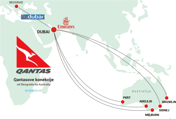 Putnici iz Beograda mogu leteti direktno do Dubaija letovima flydubaija, gde potom presedaju na letove Qantasa ili Emiratesa, sa Qantasovom oznakom.
