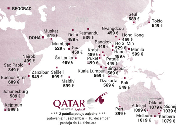 Izabrane destinacije u Aziji, Africi i Australiji, koje su na ovoj fantastičnoj promociji možete videti na priloženoj mapi zajedno sa cenama za povratne karte.