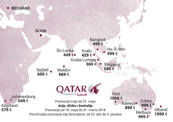 Na novoj promociji Qatar Airwaysa je većina najvažnijih destinacija. Bangkok je tokom ove promocije 499 evra, dok je Krabi, nova uzbudljiva destinacija na Tajlandru 429 evra. Šri Lanka, još jedna omiljena egzotična destinacija do koje Qatar Airways leti direktno, košta 449 evra.