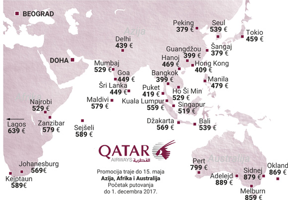 Na promociji su sve najvažnije destinacije – Šangaj je samo 379 evra za povratnu kartu, sa svim taksama i uključenim prtljagom, koliko košta i Peking. Bangkok je tokom ove promocije samo 399 evra, dok je Puket 419 evra. Šri Lanka, još jedna omiljena egzotična destinacija do koje Qatar Airways leti direktno, tokom ovih sedam dana je 449 evra.