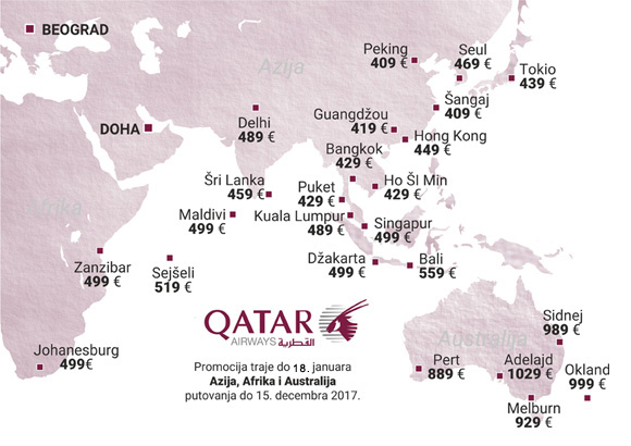 Promocija se odnosi na putovanja od 11. januara, kroz čitavu godinu, sve do 15. decembra. Hong Kong je 449 evra, Tokio je 439 evra, Seul 469 evra, Johanesburg 499 evra, Kuala Lumpur 489 evra, Singapur je 499 evra.