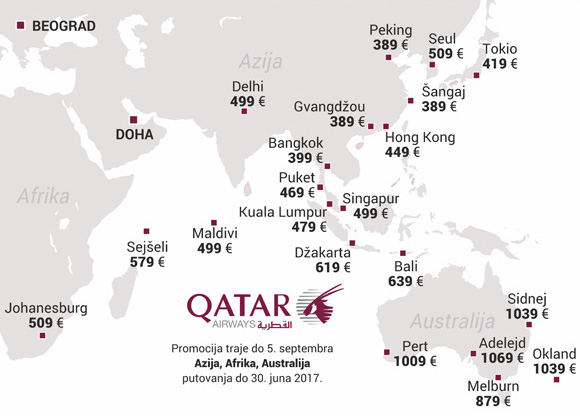Promocija traje do ponedeljka, 5. septembra, za putovanja između 15. septembra i 30. juna 2017. godine. Šangaj i Peking su 389 evra, Tokio je 419 evra, Bangkok samo 399 evra, Maldivi 499 evra, Johanesburg 509 evra, Kuala Lumpur 479 evra, Džakarta 619 evra, Sejšeli 579 evra, Bali 639 evra, gradovi Australije za nešto više od 1000 evra.