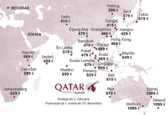 Na novoj januarskoj promociji Qatar Airwaysa ponovo su se našle neke od najpoznatijih i najzanimljivijih destinacija. Peking tokom promocije košta samo 399 evra, Šangaj je 419 evra, Hong Kong 469 evra. Bangkok je 479 evra, dok je Pataja, još jedna nova destinacija na Tajlandu 469 evra. Krabi je takođe 469 evra, dok je Čang Maj 479 evra.