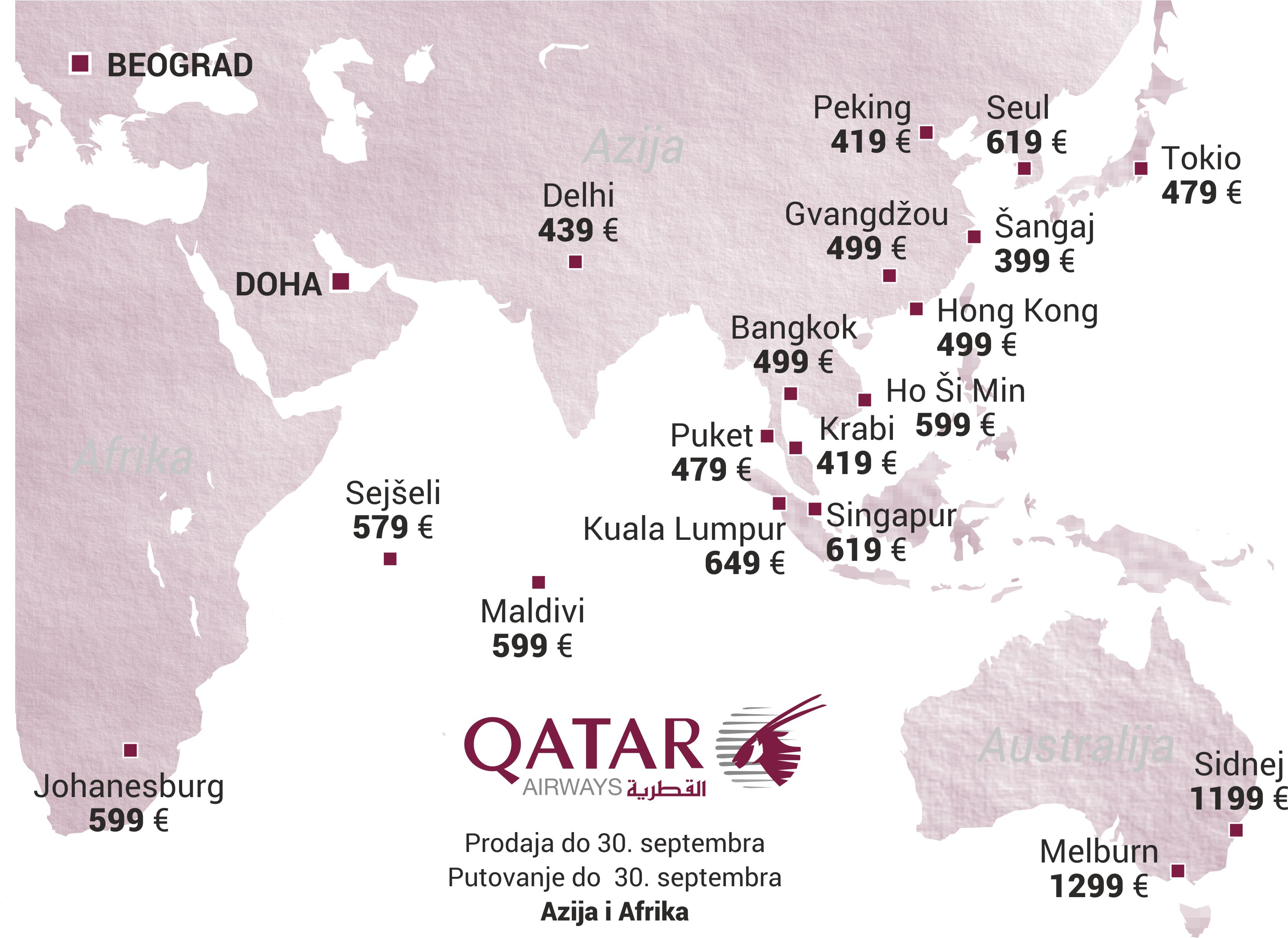 Izabrane destinacije u Aziji, Africi i Australiji, koje su na ovoj fantastičnoj promociji možete videti na priloženoj mapi zajedno sa cenoama za povratne karte.
