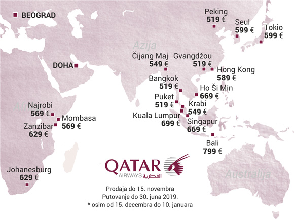Karte po ovim povoljnijim cenama nego što je uobičajeno za putovanja na Qatar Airwaysu možete kupiti do 15. novembra u našoj agenciji u Resavskoj ulici, broj 32, 2. sprat, interfon AVIOKARTA.