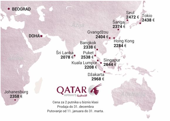 Promocija se odnosi na putovanja od 11. januara do 31. marta 2016. godine. Gvamgdžou je 2404 evra, Tokio je 2438 evra, Seul 2472 evra, Johanesburg 2358 evra, Singapur 2644 evra, dok je ukupna cena za 2 putnika na biznis klasi do Šri Lanke 2078 evra.