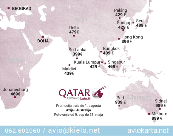 Na novoj promociji kompanije Qatar Airways našlo se 8 destinacija raspoređenih na 2 kontinenta – Hong Kong je 399 evra, Kolombo, glavni grad Šri Lanke je takođe 399 evra, dok do 1. avgusta možete kupiti povratnu kartu za Singapur za samo 469 evra, sa svim taksama i uključenim prtljagom.