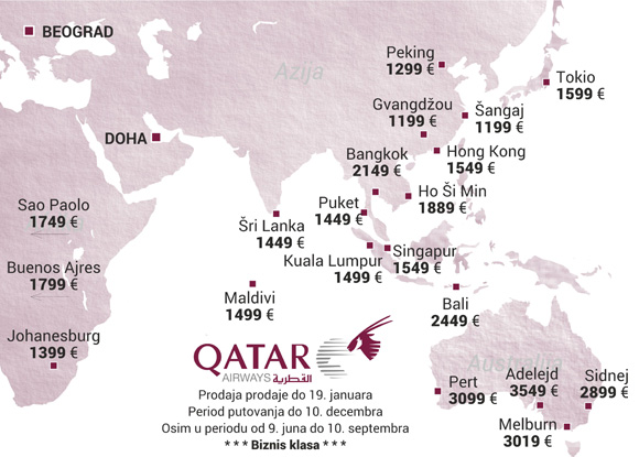 Qatar Airways je ponovo obradovao naše bogatije sugrađane. Fantastične cene za nekoliko destinacija – ali za putnike koji mogu da priušte biznis klasu. Ovog puta Qatar je ponudio niže cene na biznis klasi za neke od nama najdražih destinacija.