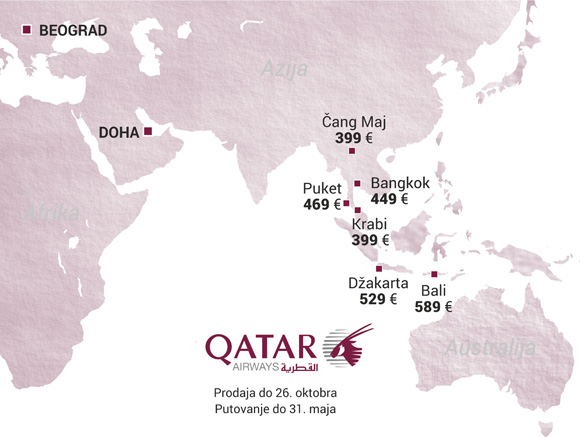 Na ovoj specijalnoj promociji Qatar Airwaysa je 6 super zanimljivih destinacija. Čang Maj i Krabi na Tajlandu su glavne zvezde ove promocije – samo 399 evra za povratnu kartu sa svim taksama i uključenim prtljagom, Bangkok je sada 449 evra, dok je Puket tokom promocije 469 evra.