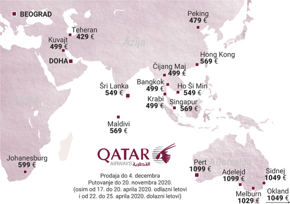 U Africi Johanesburg je 569 evra, u Iranu Teheran je 429 evra. Australija ima odlične cene – Melburn je 1029 evra, Sidnej 1049 evra, Pert i Adelejd su po 1099 evra. Okland, glavni grad Novog Zelanda, do koga Qatar leti direktno iz Dohe, košta samo 1049 evra.