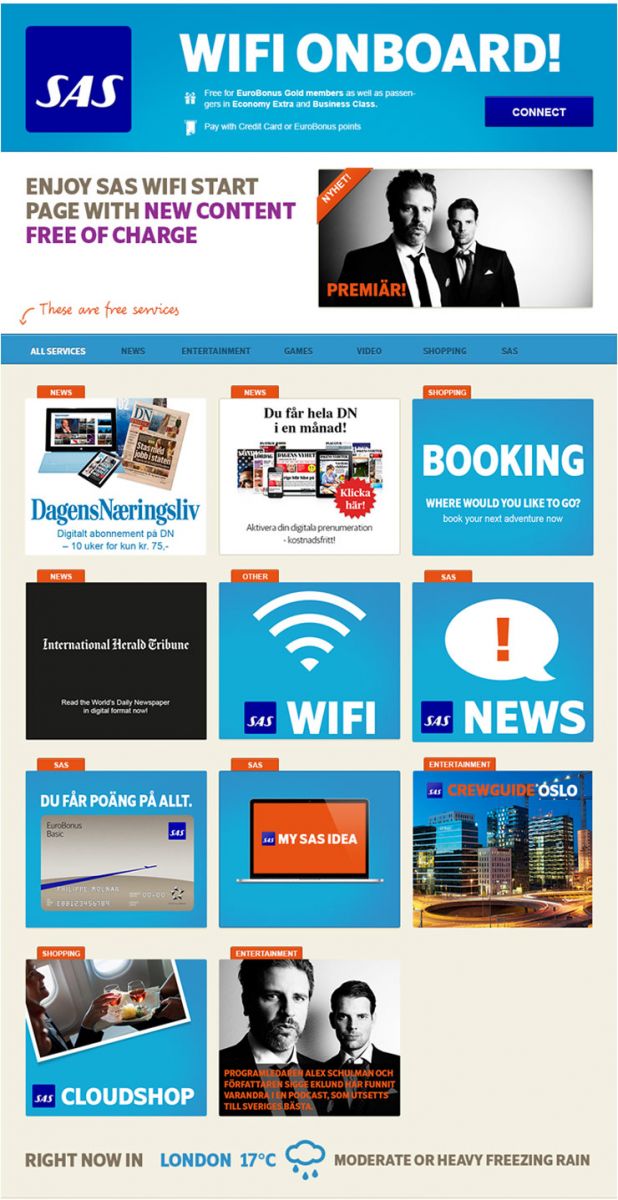 Nova naslovna stranica za bežični internet sadrži brojne nove besplatne sadržaje među kojima su skandinavski i međunarodni mediji, švedske radio stanice, SAS-ove kompanijske stranice sa bitnim informacijama za putnike i za članove frequent flyer programa kao i stranica programa "My SAS idea", na kojoj putnici mogu da postave sopstvene ideje za unapređenje usluga aviokompanije. Ovaj program će se koristiti i za poboljšanje usluge WiFi prema savetima i preporukama putnika.